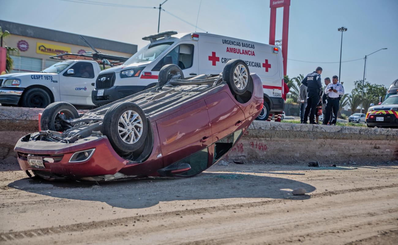 El incidente involucró a un automóvil Chevrolet Aveo de color rojo, con placas de Baja California, que terminó volcado con las llantas hacia arriba sobre la zona de construcción de los carriles confinados.
